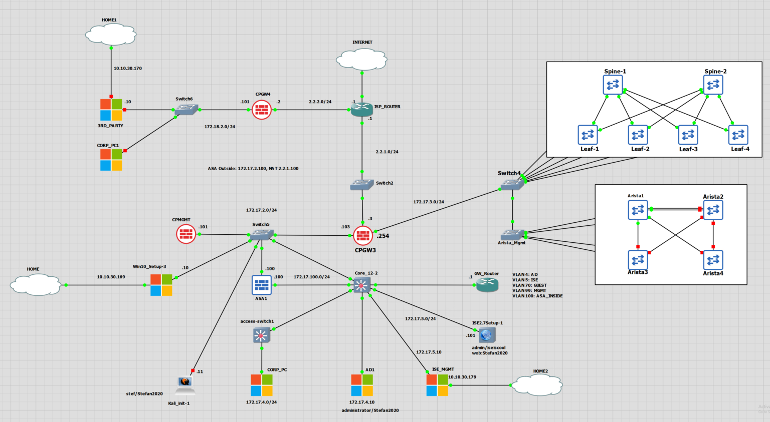 I have two topologies in my lab environment, a spine and leaf topology and a standard collapsed core topology. These topologies are part of a larger one that I used for ISE.